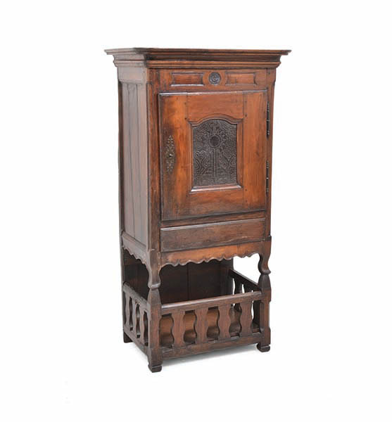 The stepped, rounded cornice above a panelled door with a central pierced metal grill, the lower section with a single frieze drawer and an open storage compartment, 79 x 154 x 53 cm (pelmet loose, as found)