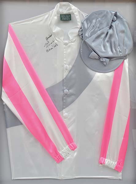 replica Mitty's silks signed by jockey Brian York, owner Nick Moraitis and trainer Jack Denham, with matching cap, framed; including supporting paperwork