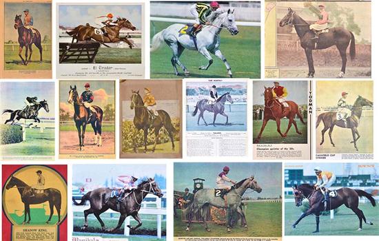 1919-1980s, including hand coloured photographs, newspaper supplements, cuttings and reproductions, to include: Tulloch, Beau Vite, Gloaming, Gunsynd, Rakwool, Tea Cake, Last End, Todman, How Now and Sir Dane, all framed (30)
