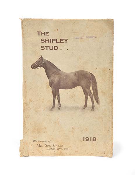 'The Property of Mr Sol. Green...at Shipley, Allansford, Victoria on Wednesday, 9th January, 1918', paper wrappers, comprising 72 lots, with black and white photographs of selected horses including Comedy King, winner of 1910 Melbourne Cup, Biplane, winner of A.J.C. and V.R.C. Derby and White Star, all lots annotated in pencil with buyer's name and price realised, 164pp.