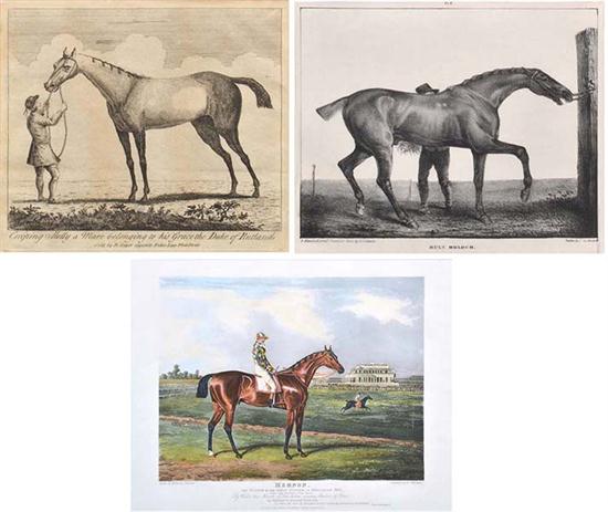 including a colour print by Mr Sutherland of a painting by M. Herring of 'Memnon The Winner of the Great St. Leger at Doncaster, 1825'; and two black and white prints of Creeping Molly and Muly Moloch (3)