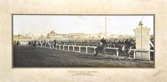 by 'Sutcliffe & Akers...Melbourne', with inscription to mount 'RICHMOND, - 19.8.15, - LADIES' PURSE,/ won by 'HERBERT MAC'/ Owner M. Morris. Rider W. Whitbourn', framed