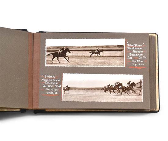 1930s-1940s, 46 black and white photographs taken at various racecourses including Caulfield, Moonee Valley, Camperdown, Warnambool, Ballarat, Geelong and Bendigo, in 'Akers & Co. Photographers' leatherbound album with gilt lettering to front 'P.J. Kearns'