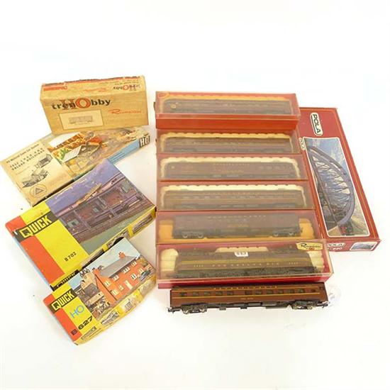 COLLECTION OF RIVAROSSI (ITALY) PLASTIC TRAINS; POLA (WEST GERMAN) BRIDGE; EHEIM (WEST GERMAN) 4032 LOAD AND UNLOAD BUILDINGS; 2 X QUICK (WEST GERMAN) MODEL SETS (G-E BOXES F-G) (LOT)