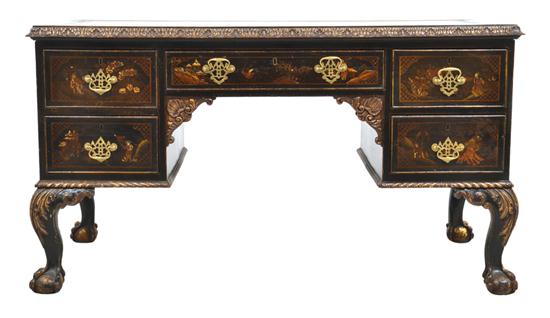 Rectangular with a tooled leather inset top, above a central drawer and further two drawers