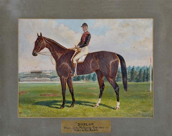 signed lower right 'Fred Woodhouse', titled and inscribed on plaque lower centre 'Winner of the 'Melbourne Cup' 1887. 3.28 1/2/ Ridden by Tom Sanders'