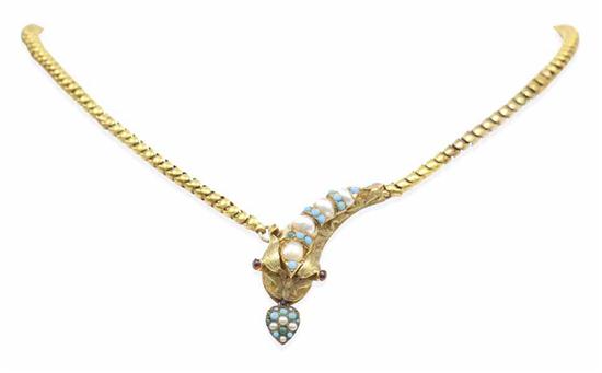 Comprising a tapering snake link chain terminating in a serpents head clasp set with seed pearl, turquoise and rubies, suspending a heart shaped charm, in 15ct gold, total length 420mm, boxed.