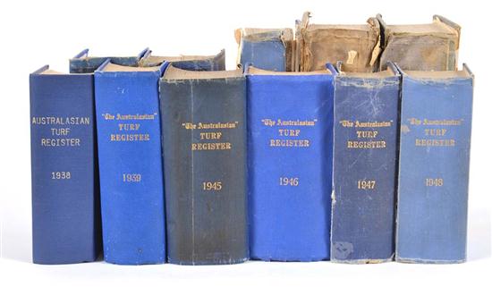including 1899, 1903, 1914-1916, 1922, 1925-1927, 1929, 1930, 1932, 1938, 1939, 1945-51, 1958-63, 1975; 2 vols. of the Australasian Turf & Stallion Register 1952 and 1954; and 2 vols. of the Argus Turf & Stallion Register, 1956-57 (32)