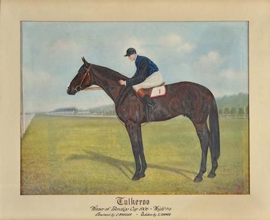initialled lower right 'FW 1912', inscription to mount 'Tulkeroo/ Winner of Bendigo Cup 1906 - Weight 9.6/ Trained by C. WHEELER - Ridden by E. TURNER'