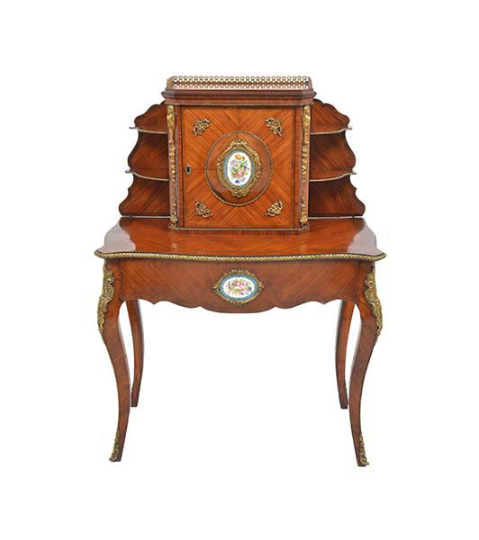 The canted rectangular back with a central cabinet inset with a porcelain medallion and two shelves to either side, above a frieze drawer, cabriole supports, 93.5 x 127 x 50cm.