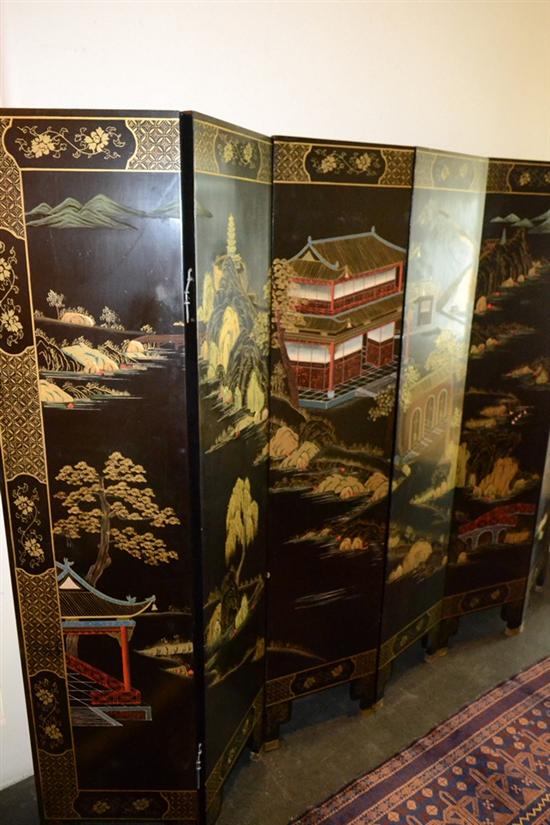 Painted in gilt and polychrome with pagodas in a garden setting over six panels, on a black lacquered ground, 183.5 x 243cm.