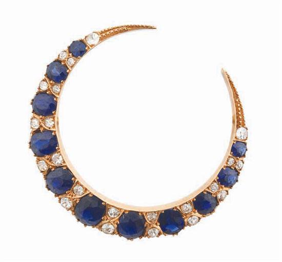 Of crescent design, set with oval sapphires graduating in size with old European cut diamond detail, in 18ct gold, independent valuation available.