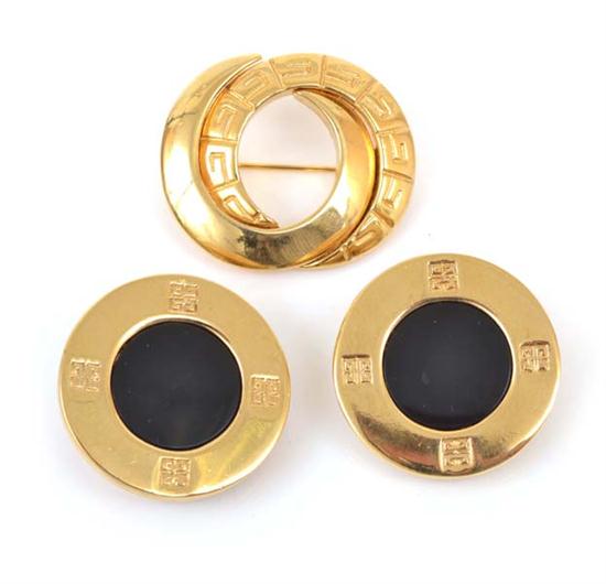 The earrings styled with black composite centres with monogram detail, to clip fittings, together with a stylized monogram brooch, all in gilt metal.