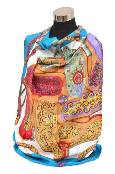 The 'Festival' design by Henri d'Origny, styled in multi-colours with a white background and a turquoise border, 90cm square.