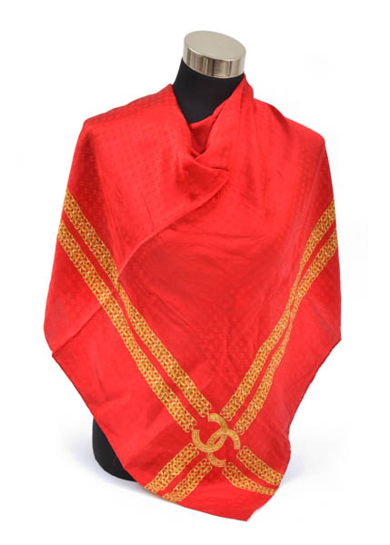 Styled with feature monogram design in red with gold chain printed border, 90cm square.