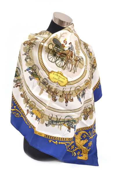 The 'La promenade de Longchamps' design by Philippe Ledoux, featuring an equestrian theme on a white background with blue border, 90cm square.