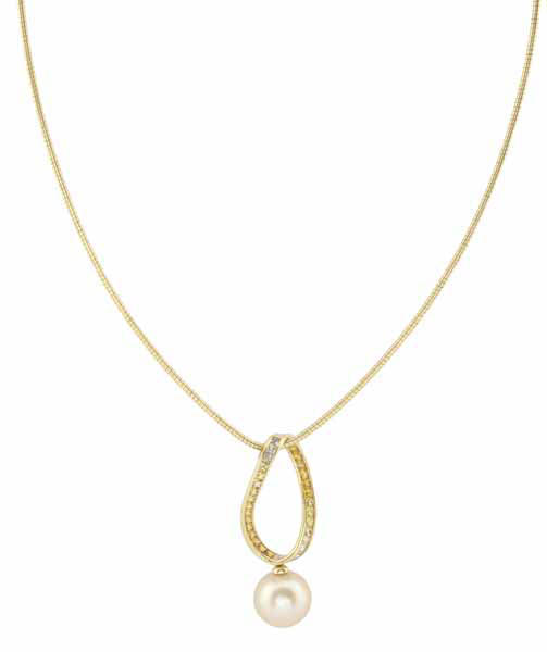 Comprising a round pearl of golden hues, measuring 11.7mm, to an oval surmount set with yellow sapphires, on an omega collar, in 18ct gold.