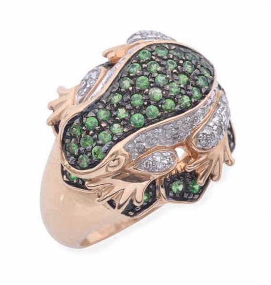 A DIAMOND AND TSAVORITE GARNET FROG RING