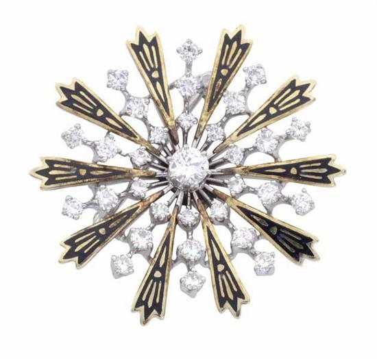 Of starburst design, comprising diamond set spokes alternating with enamel set spokes, in 14ct gold.