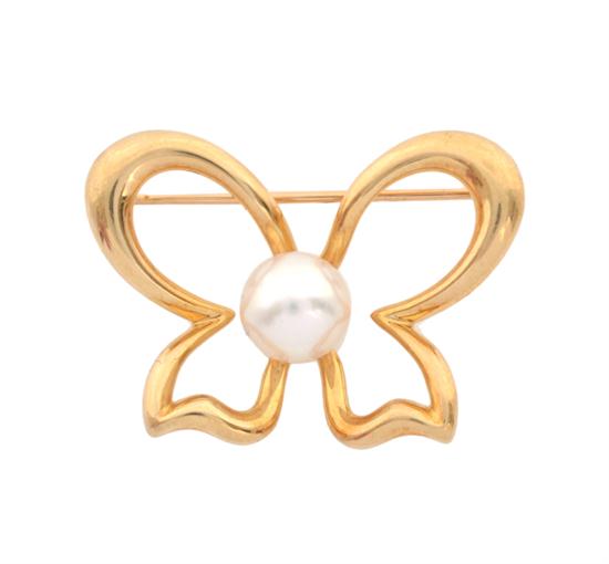 Of open bow design, centred with a cultured pearl, in 18ct gold.