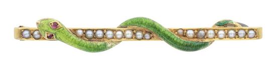 The fine bar set with seed pearls, entwined with an enamel set snake, in 15ct gold.