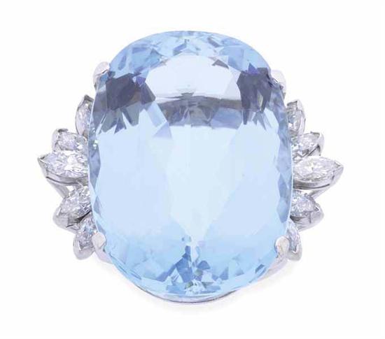 Centred with a cushion cut aquamarine weighing 35.0cts, flanked by five marquise cut diamonds to each shoulder, in 14ct white gold, ring size P-Q.