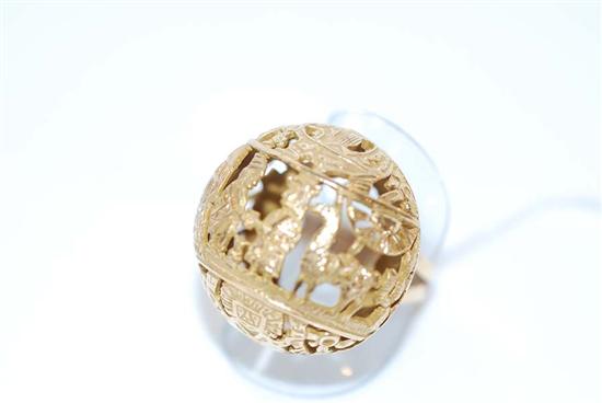 Of pierced spherical form, depicting Inca motifs, in 14ct gold, ring size M-N.
