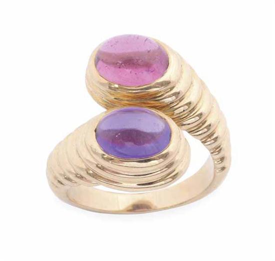 Of crossover design, the terminals set with an amethyst and a tourmaline cut en cabochon, within a tapering reeded surround, in 18ct gold, ring size L-M.