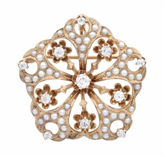 AN ANTIQUE DIAMOND AND SEED PEARL BROOCH/PENDANT