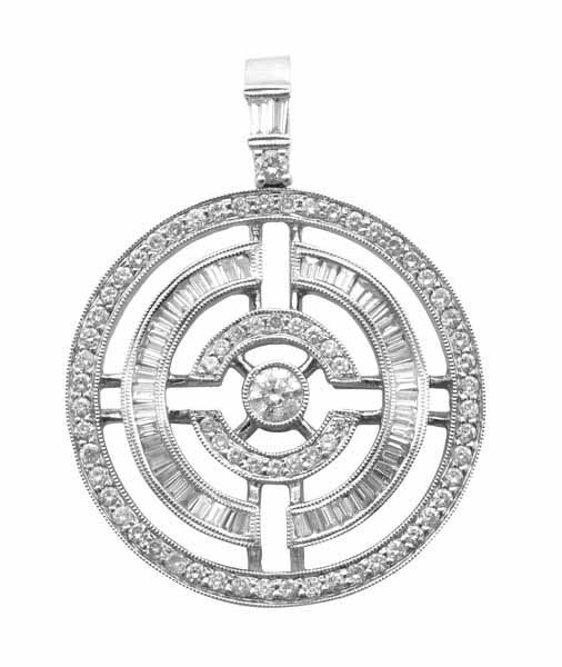 The pierced circular pendant centred with a round brilliant cut diamond weighing 0.20cts, surrounded by concentric rows of round brilliant and baguette cut diamonds in millegrain decoration, in 14ct white gold.