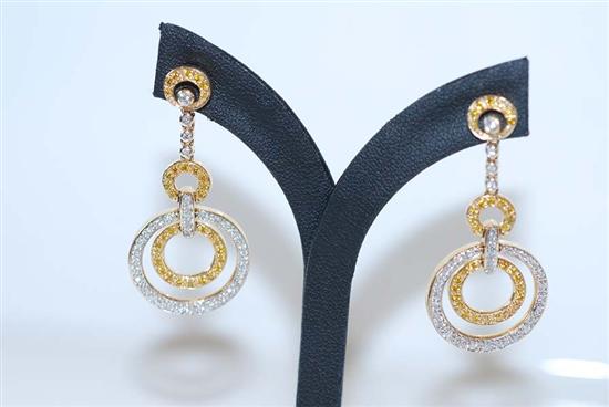 Each earring comprising articulated circular drops set with round brilliant cut diamonds, to conforming stud fittings, in 14ct two tone gold.