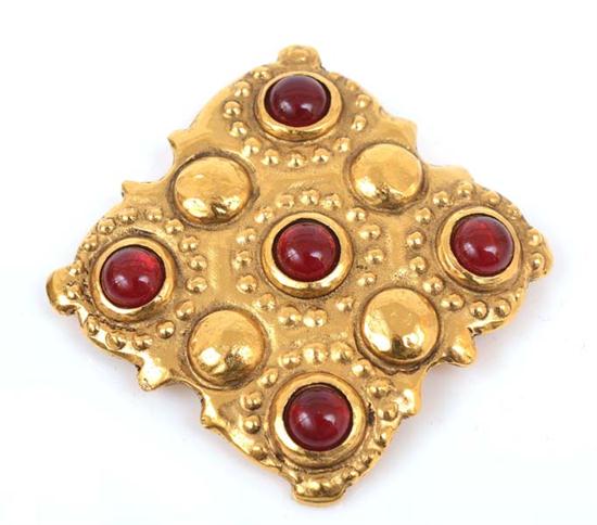 Styled in gilt metal, set with cabochon red paste set stones.