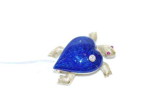 The finely crafted enamel set tortoise with diamond and ruby detail, in textured 18ct gold.
