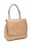 Styled in beige leather with textured leather handle and silver metal hardware, 28 x 34cm.