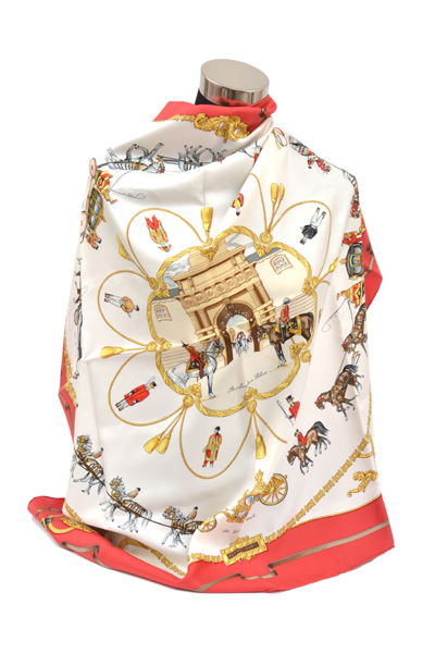 The 'Royal Mews' design by Jean De Fougerrolle, featuring historical coaches on a white background with a red border, 90cm square.