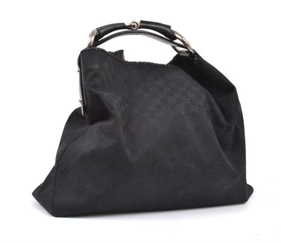 Styled in black monogram canvas with black plaited leather trim and handle featuring a horse bit, 40 x 45cm.