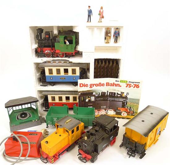 LEHMAN /LGB 1 GAUGE INSIDE/OUTSIDE TRACK LOCO SET; 2 X LOCOS; 8 X WAGONS; CRANE; TRANSFORMERS AND ACCESSORIES