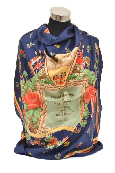 The 'Silver Jubilee' limited edition scarf, featuring a multi-coloured stylized coat of arms on a navy blue background, 90cm square.