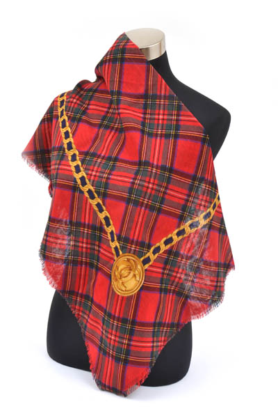 The wool blend scarf styled in red tartan with monogram detail, 90cm square.