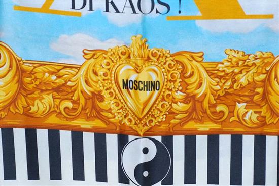 A SILK SCARF BY MOSCHINO - The 'X Anni di Kaos' design styled in gold and white with a cloudy sky background and a black and white border, 90cm square.