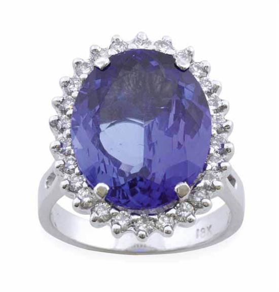 Of cluster design, centrally set with an oval tanzanite weighing 10.40cts, surrounded by twenty six diamonds totalling 1.02cts, in 18ct white gold, with independent valuation, ring size O-P.