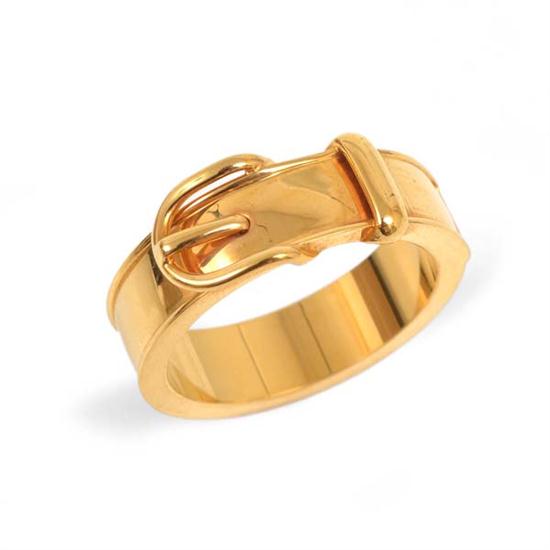 Styled as a buckle in a gilt metal finish.
