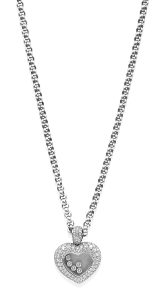 From the 'Happy Diamonds' range, the heart shaped pendant pave set with round brilliant cut diamonds, with central glazed panel encapsulating five floating diamonds on an enamelled background, in 18ct white gold, boxed.