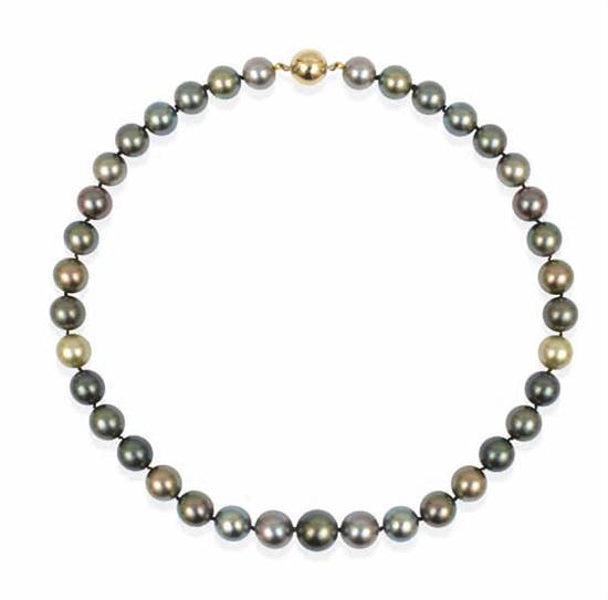 Comprising thirty seven near round pearls of varying colours and hues, measuring 10.0mm to 12.5mm, to a 14ct gold ball clasp, total length 440mm.