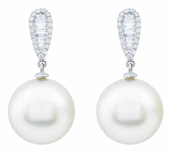Each earring comprising a round pearl of creamy hues, measuring 14.0mm, suspended below a stud fitting set with round brilliant and baguette cut diamonds, in 18ct white gold.