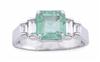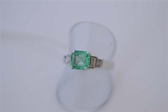 Centrally set with a square cut emerald weighing 1.58cts with two baguette diamonds to either side, in 18ct white gold, independent valuation available, ring size M-N.