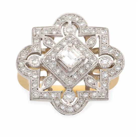 The pierced square plaque set with round brilliant cut diamonds in millegrain decoration, in 18ct gold, independent valuation available, ring size L-M.