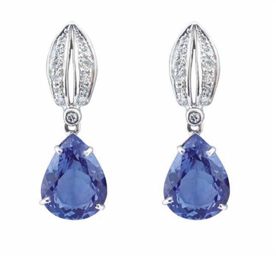 Each earring set with a pear cut tanzanite weighing 6.20cts, suspended below a split diamond set leaf shaped surmount, to post and butterfly fittings, in 18ct white gold, independent valuation available.