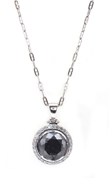 Featuring a round brilliant cut black diamond of 9.05cts surrounded by round brilliant cut diamonds totalling 0.64cts, to a fancy link chain, all in 18ct white gold, total length 400mm, independent valuation available.