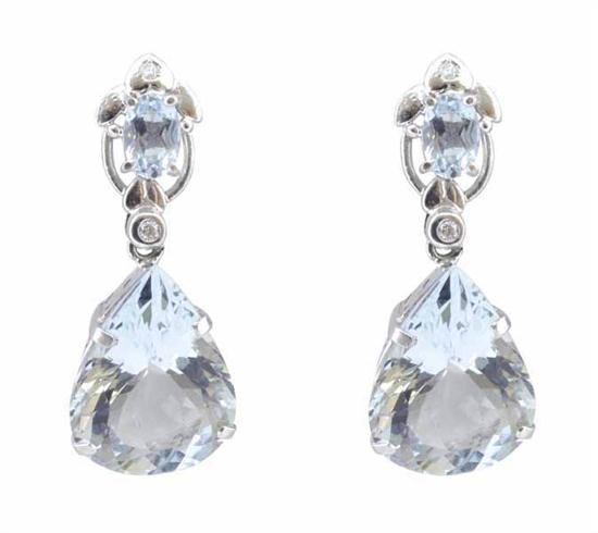 Each earring featuring a large tear drop shaped aquamarine suspended below an aquamarine and diamond set surmount, to post and butterfly fittings, in 18ct white gold, independent valuation available.